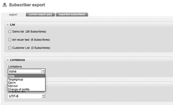 Subscribers lists can be exported from clickpublic as CSV – files. An advantage, for example, is that you can back up the address lists in this way. In the tab 'Export’, you can make choices of the lists that have to be exported. Per export only one subscriber list can be chosen. If you only want to export certain data records, you can decide on 'Limitations’. |