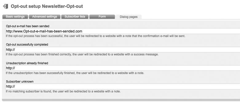 Enter a name and an optional description. Choose the 'mode' (important). The following modes are supported by 'clickpublic': Double-optout with confirmation e-mail: after unsubscribe from your website or your newsletter a confirmation email will be send automatically. Optout will be activated after clicking the confirmation link in this email. After successful unsubscription the former subscriber will get a last email („You unsubscribed successfully of our newsletter.“) Double Optout: Like described before, but without sending of a „successful unsubscription“ e-mail Confirmed Opt-Out (recommended): After unsubsubscription on your website or in your newsletter a „successful unsubscription“ email will be sended immediately. Single Optout: No e-mails will be send. There just will be a message in your browser, that optout was successfull. In Tab 'advanced settings' you can deposit your e-mail address in field 'e-mail forwarding', to be informed about unsubscriptions. Tab 'subscriberlists': Choose your favorite subscriberlist(s), where all unsubscriptions should be logged out. Select the subscriberfields, which should be filled out by your subscribers in tab 'Form'. After clicking 'create form fields' a popup appears, where you can choose and add subscriber fields to your form. Click 'sort formular fields' to arrange your fields. Click 'test form' to open a new tab in your browser with a preview of your form. Source Code of your website is genereated by 'clickpublic' by clicking 'Formular soruce code'. A popup appears with your source code. Last tab: Dialog pages |