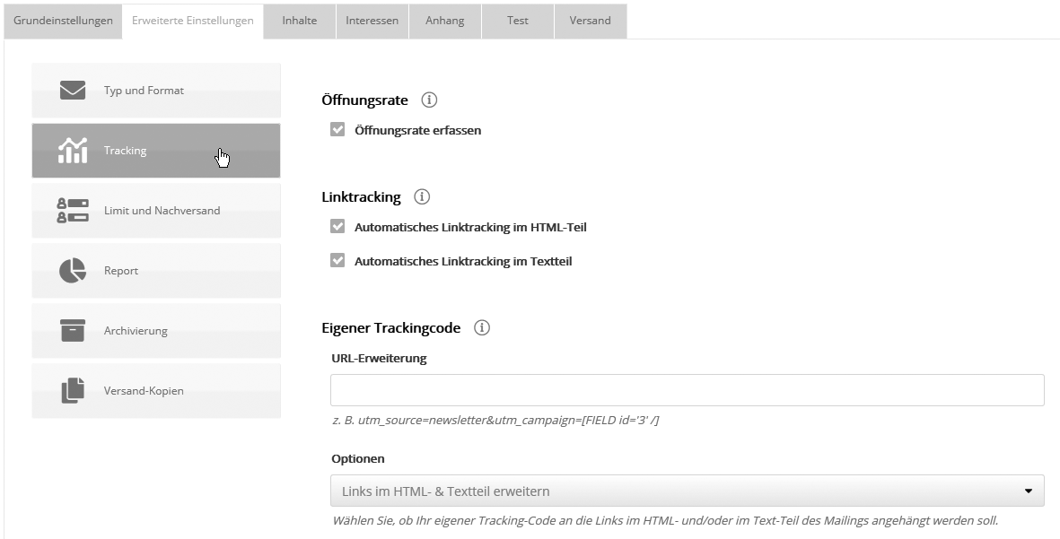 ÖffnungsrateUm nach dem Versand auszuwerten, wieviel Prozent der Empfänger das Mailing geöffnet haben (siehe 'Übersicht, Öffnungs-/Klickrate'), muss die Option 'Öffnungsrate erfassen' aktiviert sein. Dazu integriert clickpublic im HTML-Teil des Mailings ein unsichtbares Zählpixel, welches für jeden Empfänger individuell verlinkt ist und dessen Aufruf als Öffnung gezählt wird. Die Messung funktioniert unabhängig von der Mailing-Einstellung 'Inboundimages', solange der Empfänger die Anzeige von Bildern in seinem Posteingang nicht unterdrückt. Hinweis: Ist die Erfassung der Öffnungsrate deaktiviert, aber die nachfolgende Option "Linktracking" aktiviert, dann werden Klicks automatisch auch als Öffnung gewertet. Die Öffnungsrate erfasst in dem Fall nur den Teil der Öffner, der irgendeinen Link angeklickt hat. LinktrackingAktivieren Sie Automatisches Linktracking im HTML-Teil, so wird jeder im Mailing enthaltene Link durch einen Tracking-Link ersetzt, der für jeden Abonnenten individualisiert ist. Diese Tracking-Links werden über den clickpublic-Server auf die ursprüngliche Link-URL umgeleitet und dabei gezählt. Damit können Sie nach Versand des Mailings sehen, wie oft jeder Link angeklickt wurde (siehe 'Übersicht, Öffnungs-/Klickrate'). Weiterhin lassen sich darauf basierend Zielgruppen bilden, z. B. "Alle, die Link B angeklickt haben" können erneut mit weiteren Informationen angeschrieben werden. Bitte beachten Sie, dass Sie jede URL vorher als Link definieren müssen. Sie können die Richtigkeit der Tracking-Links überprüfen, indem Sie sich ein Testmailing zusenden. Eigener Tracking-CodeHier ist es möglich, alle Links des Mailings automatisch um eigene Parameter zu erweitern. Damit lässt sich das weitere Verhalten der Newsletterempfänger per Website-Analyse-Tools wie z.B. Google Analytics, Piwik oder econda tracken. Kopieren Sie dazu den Tracking Code Ihres Tools in das Feld, damit clickpublic ihn automatisch an alle externen Links Ihres Mailings anhängt. Folgende Parameter werden unterstützt: