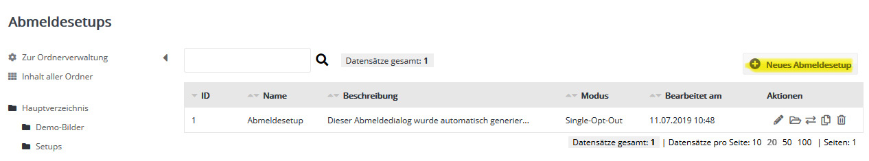Ablauf einer AbmeldungKlickt der Empfänger den Abmeldelink an, wird ein in clickpublic eingerichtetes 'Abmeldesetup' angestoßen und der Abonnent vom Newsletter-Empfang abgemeldet. Das kann je nach Einstellung entweder sofort oder nach nochmaliger Bestätigung (Double-Opt-Out, nicht empfehlenswert) passieren. In den Eigenschaften eines Abmeldesetups wählen Sie die Bestätigungsnachricht aus und optional die Abonnentenlisten, aus denen der Abonnent entfernt werden soll. Ist der Abonnent aufgrund der Abmeldung in keiner einzigen Abonnentenliste mehr enthalten, wird er auch aus der 'Abonnentenverwaltung' entfernt. Neues Abmeldesetup erstellen |