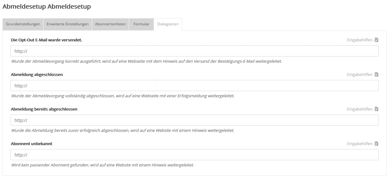 AbonnentenlistenJe nachdem, ob die Abmeldung per Newsletter-Link oder per Website-Formular stattfindet, wird der Abonnent aus folgenden Listen abgemeldet: Variante 1: Abmeldelink im NewsletterFür Standardmails gilt: Zusätzlich zu den auf dem Reiter 'Abonnentenlisten' gewählten Listen findet die Abmeldung auch in den angeschriebenen Listen statt. Für Kampagnen- und Dialogmails gilt dieser Zusatz nicht, da diese nicht an eine bestimmte Liste verschickt werden. Variante 2: Abmeldeformular auf WebsiteDie Abmeldung findet in den unter 'Abonnentenlisten' markierten Listen statt, und wenn vorhanden, dann auch in den direkt im Formular zur Auswahl durch den Nutzer angebotenen Listen (siehe nächster Abschnitt 'Formular'). Beides gleichzeitig ist nicht möglich. Das heißt: Sobald Sie eine Liste im Reiter 'Abonnentenlisten' markiert haben (und damit fest vorgeben), kann sie nicht gleichzeitig im Abmelde-Formular (ab)wählbar sein. Im dem Fall wird sie automatisch aus dem Formular entfernt und umgekehrt. Sonderfall beim Abmeldeformular: Ist keine Liste zur Abmeldung markiert und auch im Formular keine enthalten, dann findet die Abmeldung in allen Listen statt. Damit wird der Abonnent auch aus der 'Abonnentenverwaltung' entfernt. FormularHier erstellt clickpublic automatisch den Quellcode für ein Abmeldeformular, das Sie auf Ihrer Website einbinden können. Den Inhalt des Formulars stellen Sie per Drag&Drop zusammen. Die Bedienung ist identisch zum Anmeldeformular-Editor. Nach Klick auf den Button 'Test des Formulars' wird Ihr neues Abmeldeformular angezeigt und die Funktion lässt sich anhand realer Abmeldungen testen. Geben Sie gültige und ungültige Abonnentendaten ein, um die entsprechenden Textmeldungen bzw. Dialogseiten zu prüfen. Ein während des Tests abgemeldeter Abonnent lässt sich unter 'Abonnenten' -> 'Abmeldungen' wiederherstellen. --> Hinweis zu Abmeldungen beim Testversand: Solange es sich um den Testversand eines Mailings handelt, findet bei Klick auf den Abmeldelink keine Abmeldung statt. Stattdessen wird lediglich eine Bestätigung angezeigt, ob das Abmeldesetup korrekt eingerichtet wurde. Erst beim späteren realen Versand findet eine tatsächliche Abmeldung statt und es erscheint die von Ihnen eingestellte Dialogseite, die Sie unter 'Formular testen' jederzeit testen können. Dialogseiten |